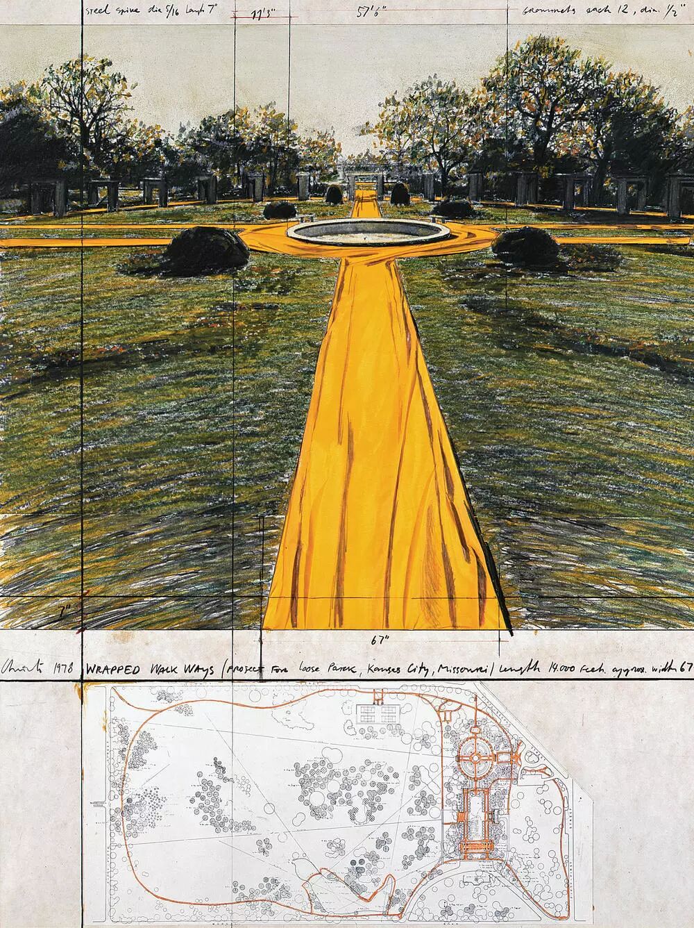 Christo,Wrapped Walk Ways (Project for Loose Park, Kansas City, Missouri),Collage 1978.Pencil, charcoal, pastel, fabric, photograph by Wolfgang Volz, wax crayon and map,28 x 22" (71 x 56 cm),Photo: Wolfgang Volz.