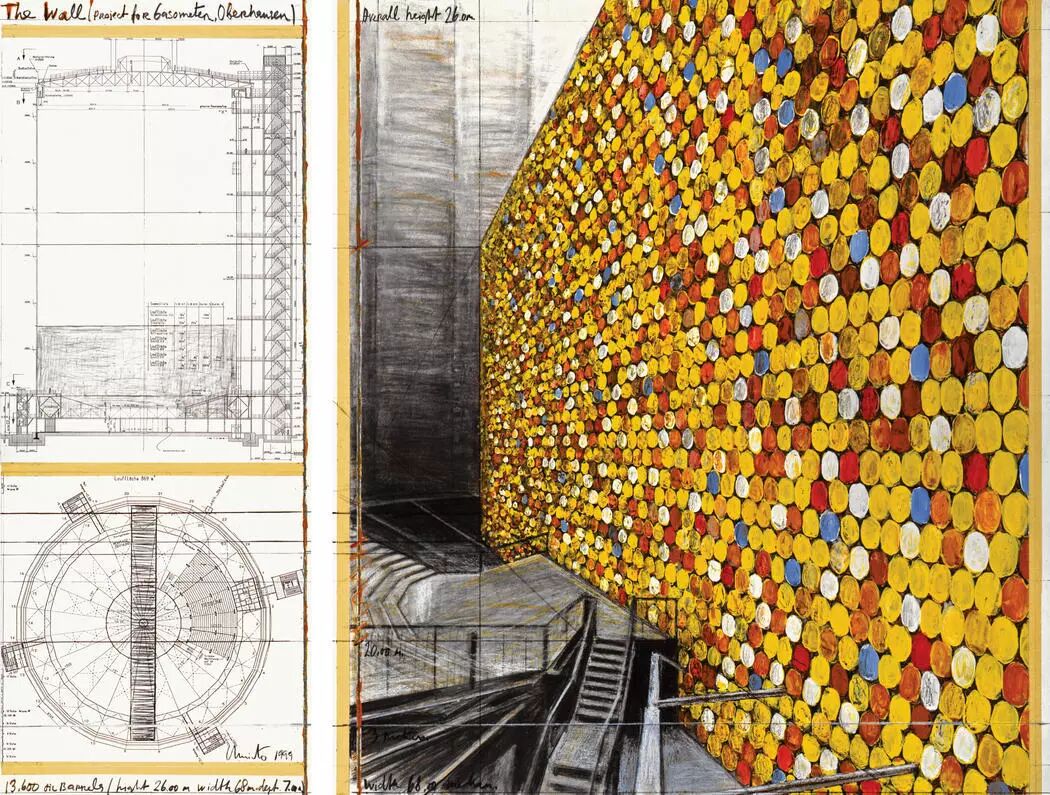 從1958年起,克里斯托和珍妮-克勞德就開(kāi)始用木桶創(chuàng)作作品。因?yàn)樗鼈兊牡袼苄Ч偷统杀?,被證明是適合克里斯托的工作材料,并很快成為藝術(shù)家作品的主導(dǎo)因素。