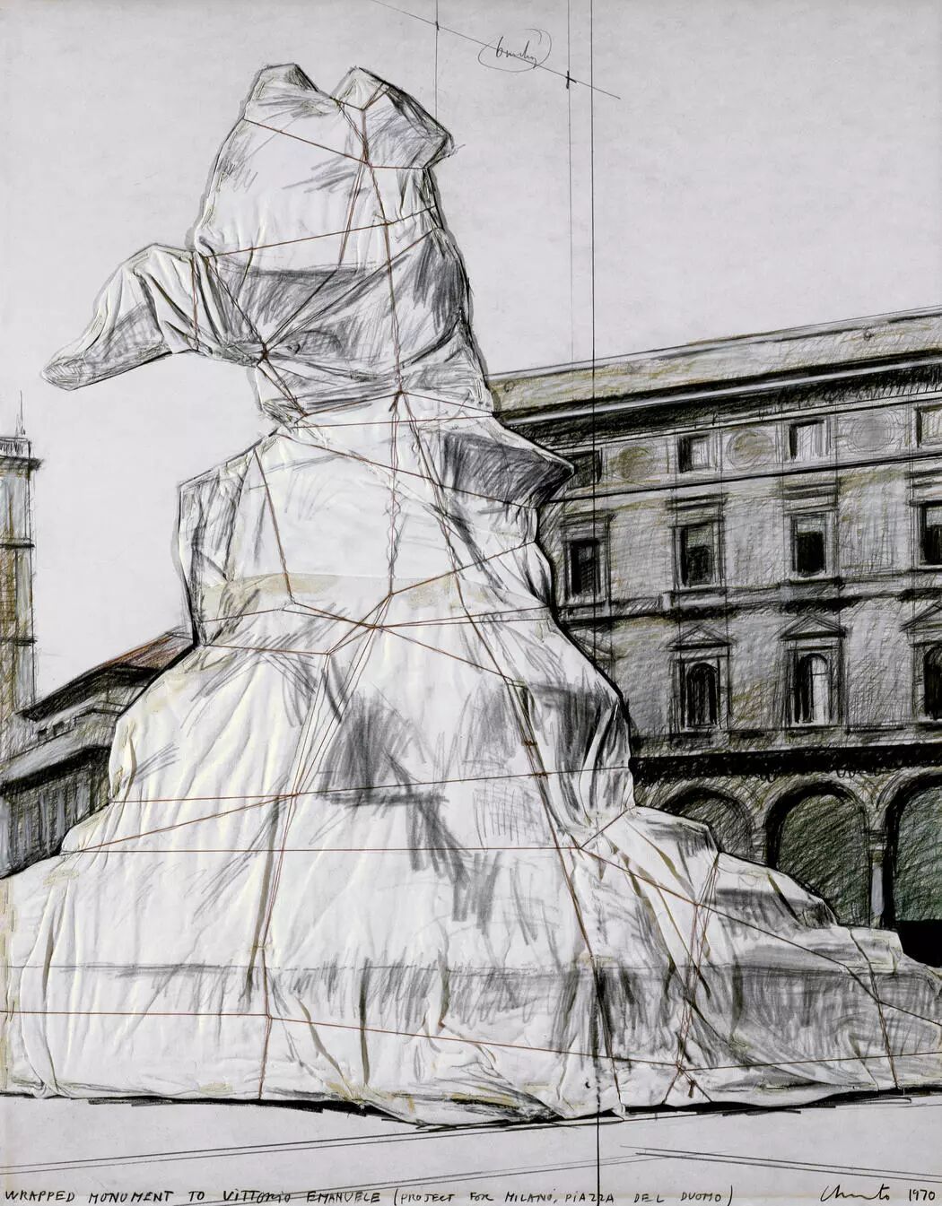 1970年秋天,在意大利米蘭,克里斯托和讓-克洛德包裹了意大利國(guó)王維托里奧·埃馬努埃萊二世的紀(jì)念碑和列奧納多·達(dá)·芬奇的紀(jì)念碑。