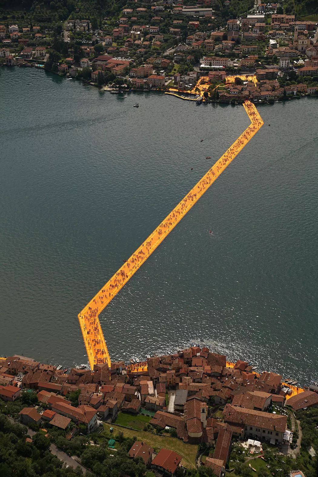 2016年6月18日至7月3日,意大利的伊塞奧湖被重新設(shè)計(jì)。漂浮的橋墩由10萬(wàn)平方米泛著微光的黃色織物組成,由22萬(wàn)個(gè)漂浮在水面上的高密度聚乙烯立方體組成的模塊化碼頭系統(tǒng)承載。