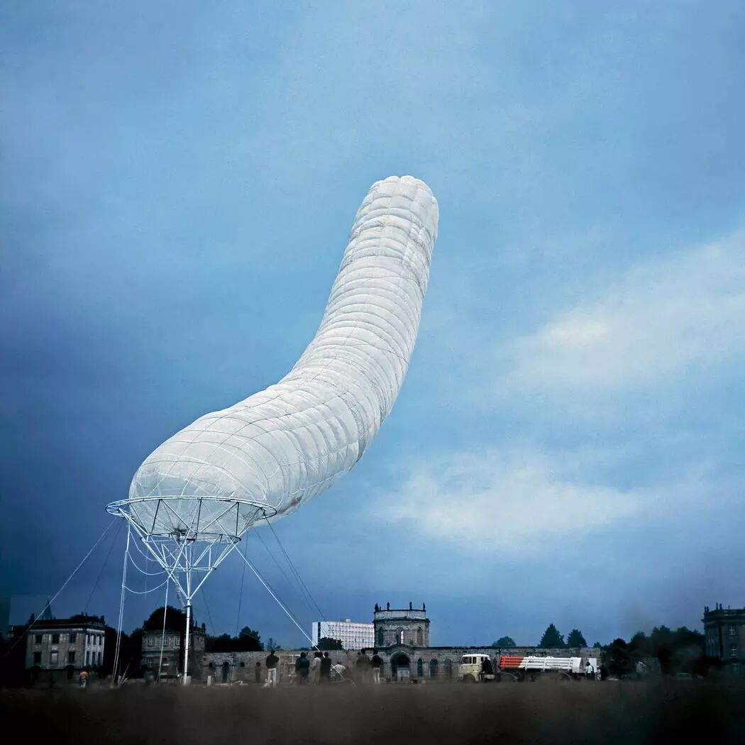 1968年,在德國(guó)卡塞爾第四屆文獻(xiàn)展上,克里斯托和克勞德創(chuàng)造了有史以來(lái)最大的沒(méi)有骨架的充氣結(jié)構(gòu)。經(jīng)過(guò)三次失敗的嘗試,它于1968年8月3日在五臺(tái)起重機(jī)的幫助下豎立起來(lái),其中兩臺(tái)起重機(jī)高230英尺(70米),每臺(tái)重200噸。