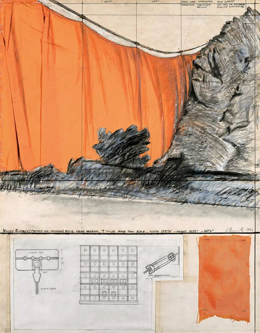 1972年,在科羅拉多的兩個(gè)山坡之間安裝了谷幕。橙色的窗簾是由200,200平方英尺(18,600平方米)的尼龍織物制成的。工程完成28小時(shí)后,一場(chǎng)大風(fēng)使拆除工作不得不開(kāi)始。