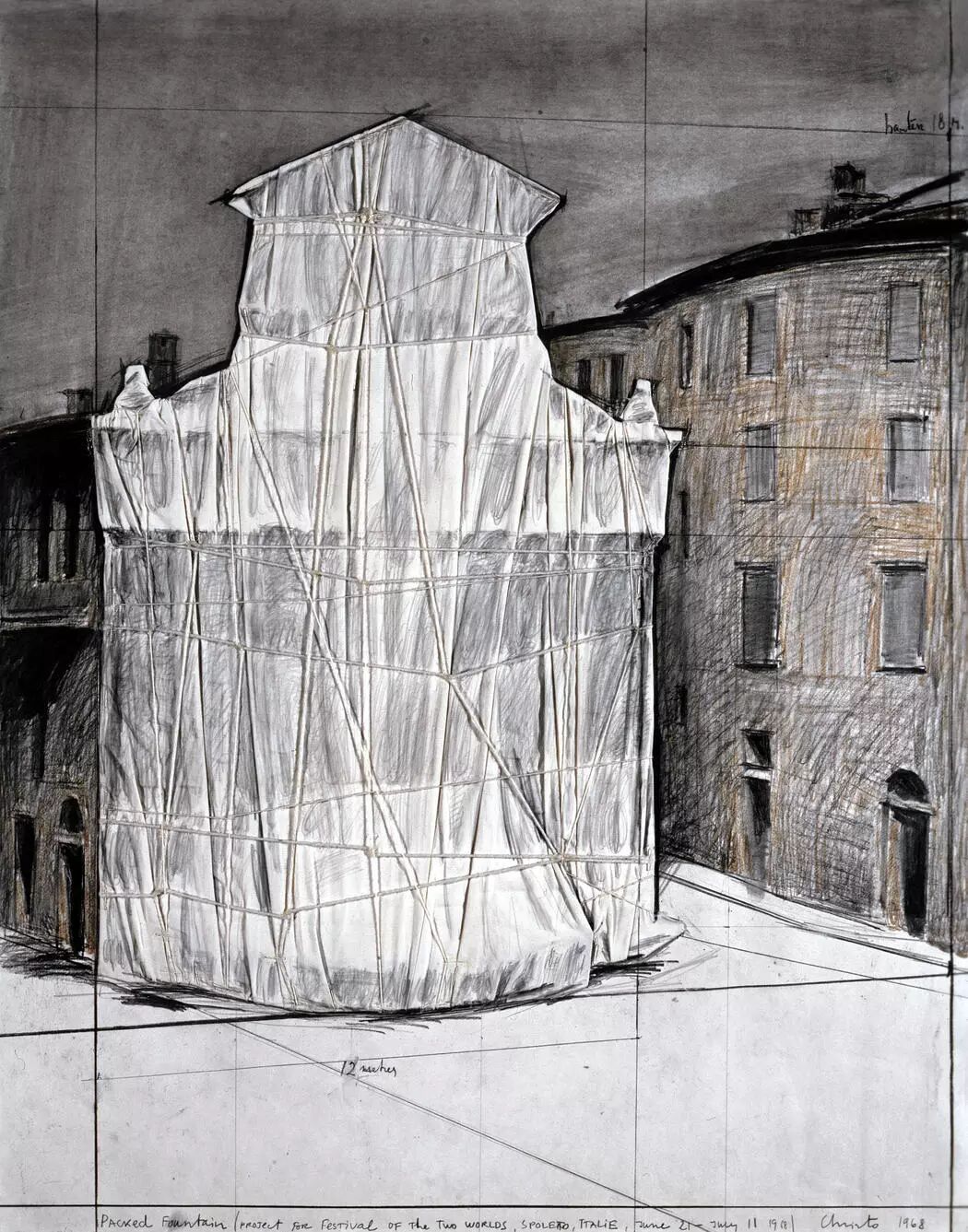 包裹式噴泉和包裹式中世紀(jì)塔是在意大利中部山頂小鎮(zhèn)斯波萊托舉行的“兩個(gè)世界的節(jié)日”上設(shè)計(jì)的。該項(xiàng)目由Jeanne-Claude負(fù)責(zé)協(xié)調(diào),而Christo在瑞士工作,在伯爾尼創(chuàng)建了包裝藝術(shù)。