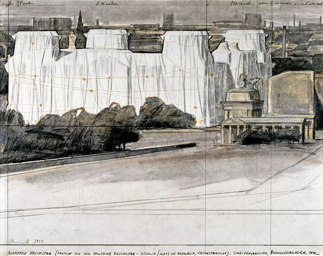 Christo,Wrapped Reichstag (Project for Der Deutsche Reichstag - Berlin),Collage 1977.Pencil, fabric, twine, pastel, charcoal and wax crayon,22 x 28" (56 x 71 cm),Kunstmuseum Bonn, Germany.Photo: Archive.