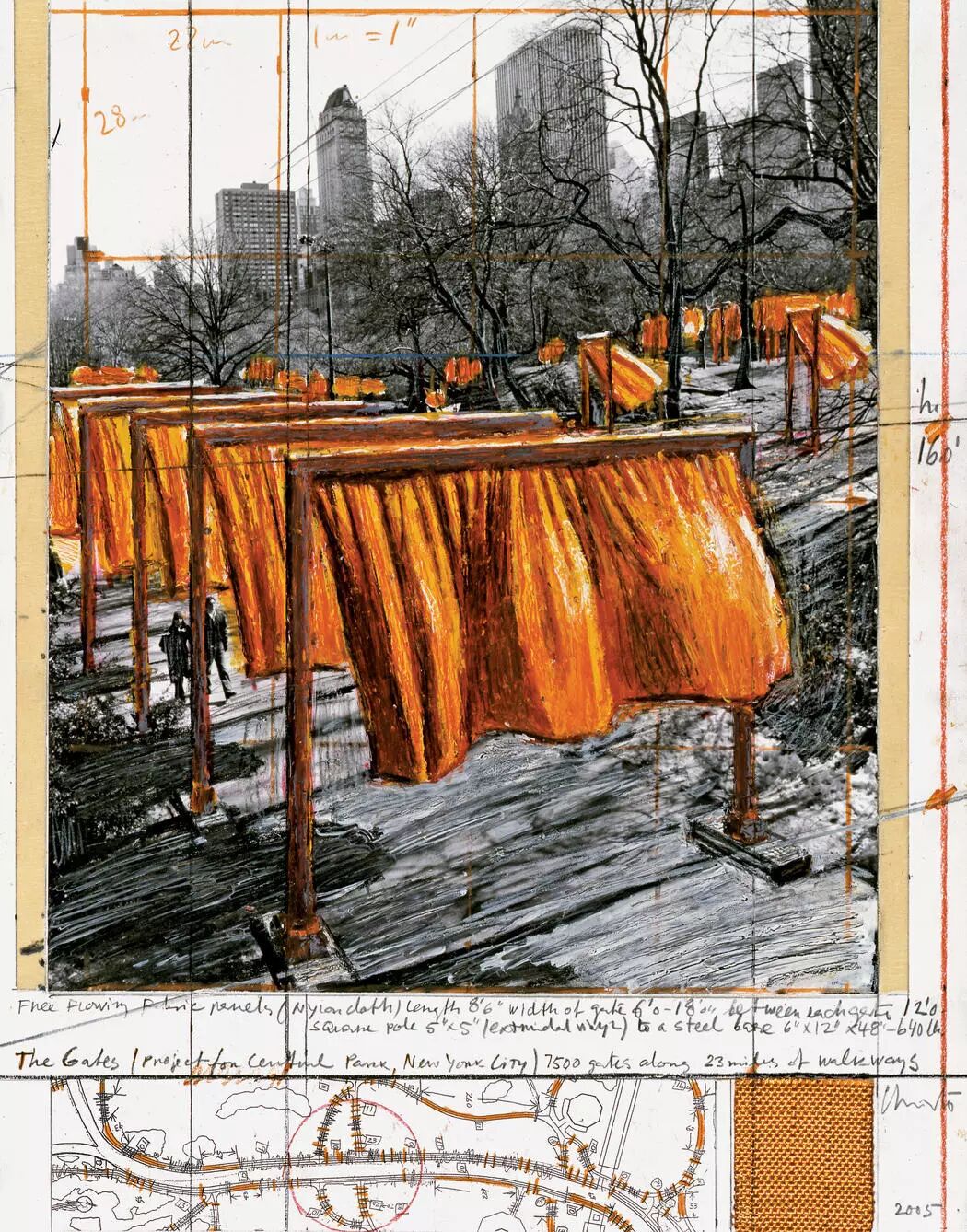 Christo,The Gates (Project for Central Park, New York City),Collage 1980.Pencil, wax crayon, pastel, fabric, photostat and fabric sample,28 x 22" (71 x 56 cm),Private collection,Photo: Archive.